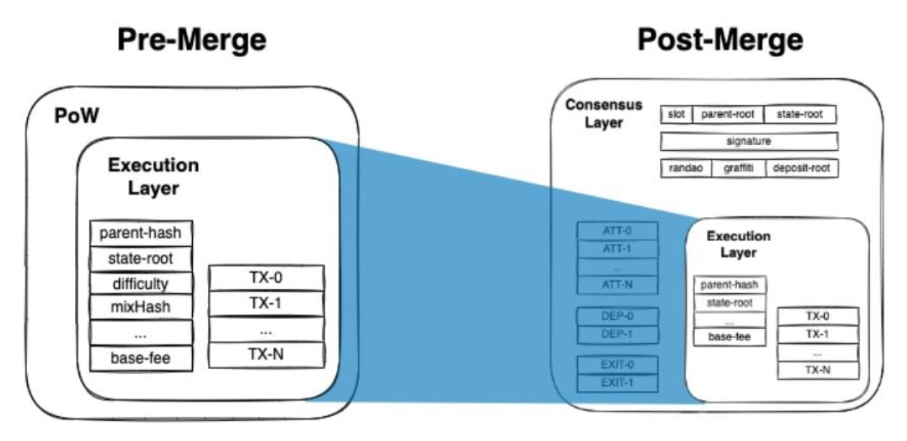Pre-Merge(PoW 사용 시기)에는 비트코인과 동일하게 block header 안에 difficulty와 mixHash 필드가 존재했다. 이는 PoW 난이도 계산과 검증을 위한 필드들이었다. 하지만, Post-Merge(PoS 전환 이후)에는 해당 필드들이 빠지고 대신 PoS에서 필요한Consensus Layer가 추가된 것을 확인할 수 있다. Consensus Layer에 대해서 살펴보면 다음과 같다.